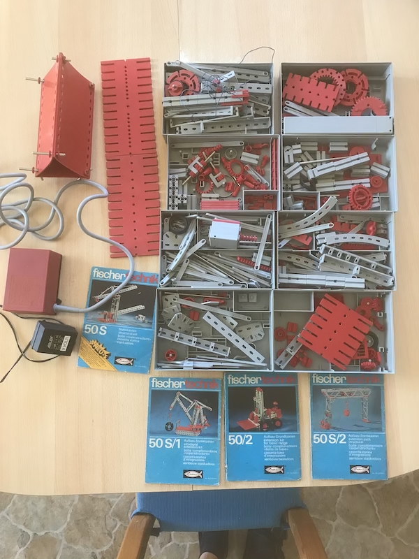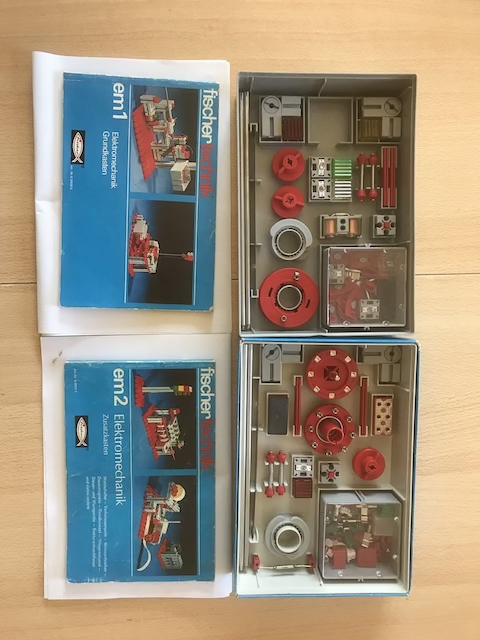 ...Konvoult Fischertechnik 80er Jahre u.a.em1, em2 (beide nicht mehr ganz komplett) , sowie 8 Kästen mit diversen Bauteilen und original Trafo.