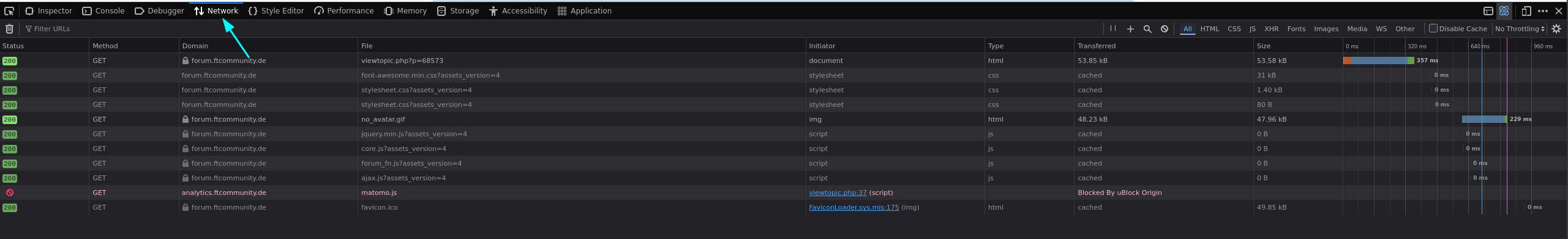 Einfach dort klicken, wo es tintenfisch dir so schön im Screenshot gezeigt hat, dann wie ich schon schrieb: Seite neu laden (am besten mit strg-F5, dann wird nichts aus dem Cache geholt). Du bekommst eine Liste jeder vom Server angeforderten Datei mit Ladezeit und Ergebnis. Vergleichen mit tintenfischs Ausgabe oder Screenshot hier zeigen. Alles was nicht grün ist wäre schon mal verdächtig.Carrera124 hat geschrieben: ↑03 Mai 2025, 12:31Dafür bin ich leider nicht genug Internet- bzw. Firefox-Spezialist, um diese Frage zu beantworten.