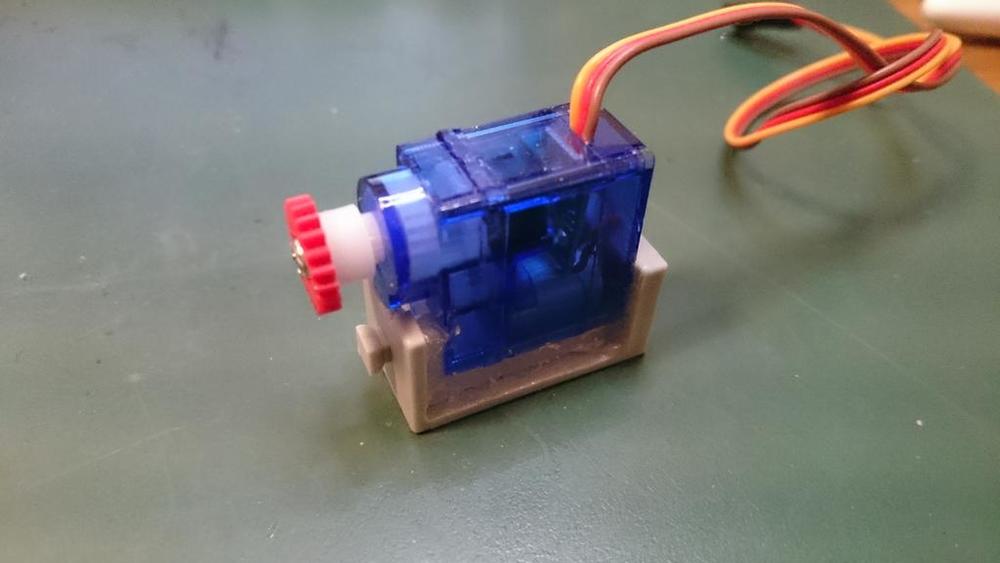 auskommen. Angesichts dieser Anforderungen haben sich die verbreiteten TowerPro SG90 Servos (und Varianten gleicher Bauform bzw. deren billige China-Klone) angeboten. Ein erster Prototyp mit Statikträger, Heißkleber und einer Riegelscheibe war vielversprechend, die Servoachse kommt hier exakt in der Mitte des 15er Rasters zu liegen (das Foto ist unvollständig, eigentlich gab es noch einen komplementären Statikträger, so dass es einen 15x30x30 Block gebildet hat, davon habe ich leider kein Foto mehr).