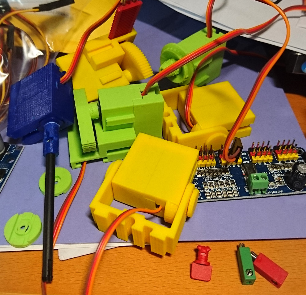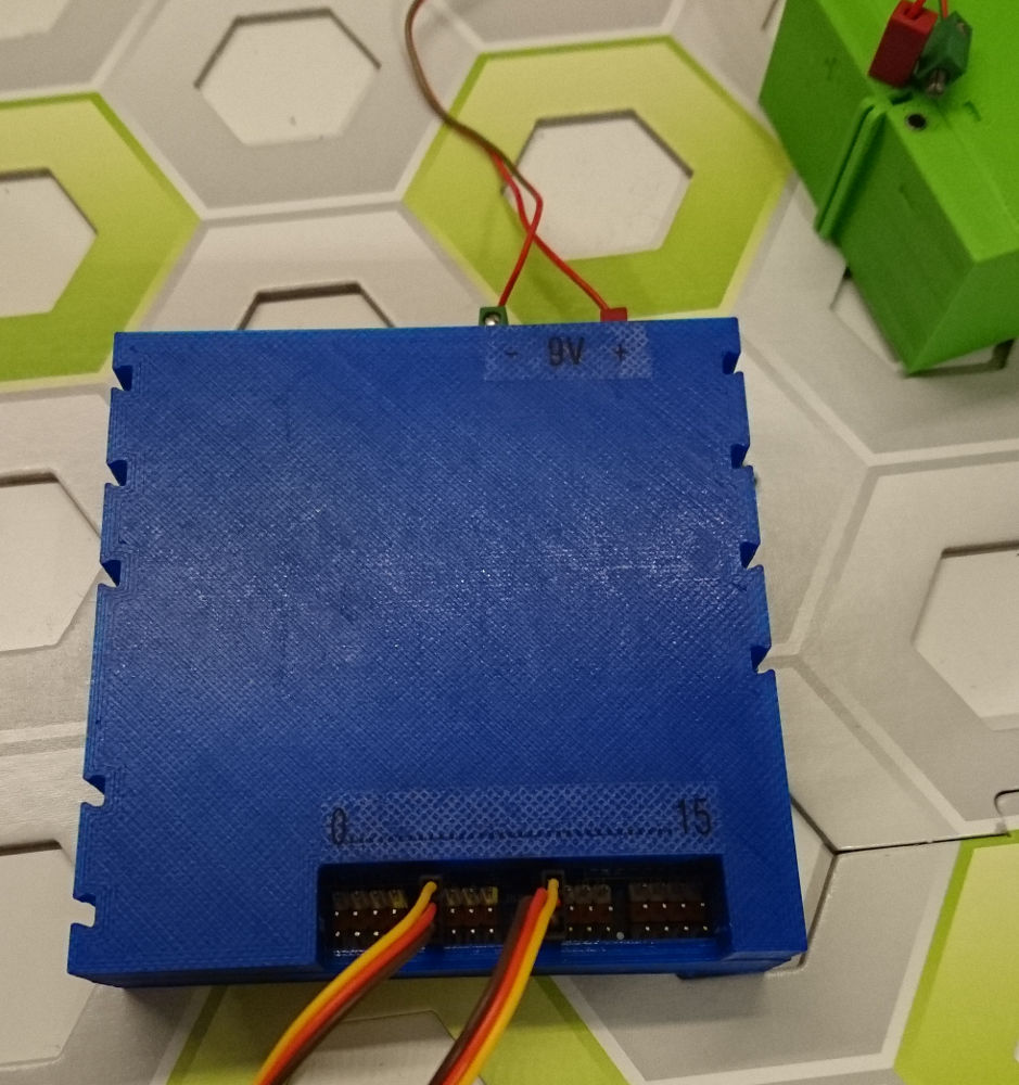 In diesem Gehäuse stecken ein Arduino Nano, der I2C-Servoshield und ein step-down-Wandler zur Spannungsversorgung von Servos und Arduino. Das Ding kann standalone laufen, ich habe aber auch schon ein Sketch geschrieben, über dass man per serieller Kommunikation den Servoshield ansprechen kann. Damit kann das Ding problemlos an allen nicht-I2C-tauglichen Hosts über USB angesprochen werden...