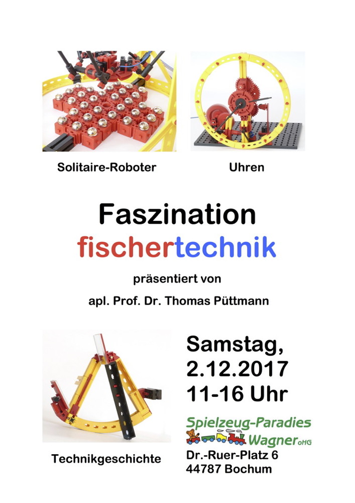 am kommenden Samstag, dem 2.12. werde ich unter dem Titel "Faszination fischertechnik" von 11-16 Uhr einige Modelle und unser Technikgeschichte-Buch im Spielzeug-Paradies Wagner http://www.spielzeug-paradies.de präsentieren. Mit dabei ist unter anderem der Delta-Roboter aus unserem kommenden Buch, der das Solitaire-Spiel in 1 min löst und gegen den man Tic-Tac-Toe spielen kann. Ich freue mich natürlich über jeden, der vorbei schaut. Im Geschäft gibt es das volle fischertechnik-Sortiment zu sehr guten Preisen. Der Weihnachtsmarkt ist direkt vor der Tür.