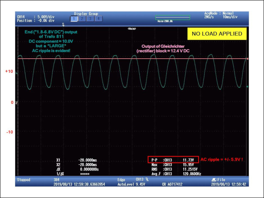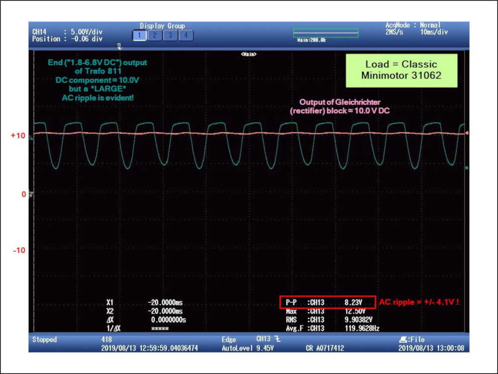 • In the first, there's no load. The output voltage seems too high and there is a LOT of AC ripple, +/– 5.9V on top of the DC component. I did attach a SIlberling Gleichrichter (rectifier block) which cleans up the ripple. • In the second, I attached a classic era minimotor to the rectifier output. (not for very long, as I didn't want to damage the motor). You can see the motor load pulls down the voltage a couple of volts, but it's still pretty high, higher than seems OK to me for a classic vintage motor. Also, since the side (AC) port is similarly high, the Gleichrichter output without that motor load applied gets well over the 9.0 V +/– 20% (i.e. 10.8 V DC) specified in the design of the other SIlberlinge. And I don't want to smoke any of those! My assumption is that there are two problems with the transformer: