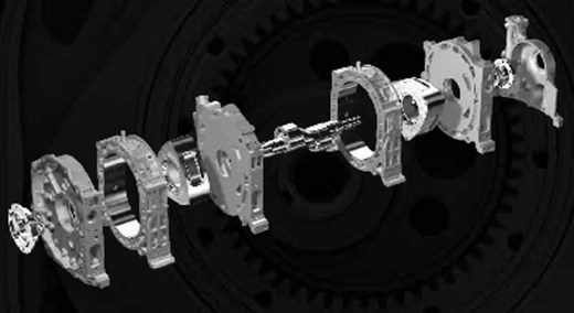 In der Mitte ein Bild vom Aufbau eines 2-Scheiben-Wankelmotors von Mazda sowie oben die Welle dazu.
