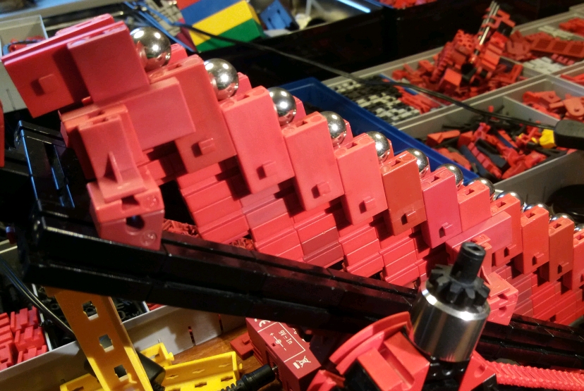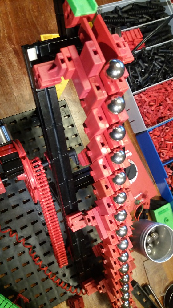Er ist inspiriert von der genialen Kugelbahn, die im Bremer Universum zu bestaunen ist. An die haben wir uns erinnert, nachdem uns unser erster Ansatz mit separaten Kurbeln und Pleueln für jede Stufe zu komplex und schwergängig geriet.