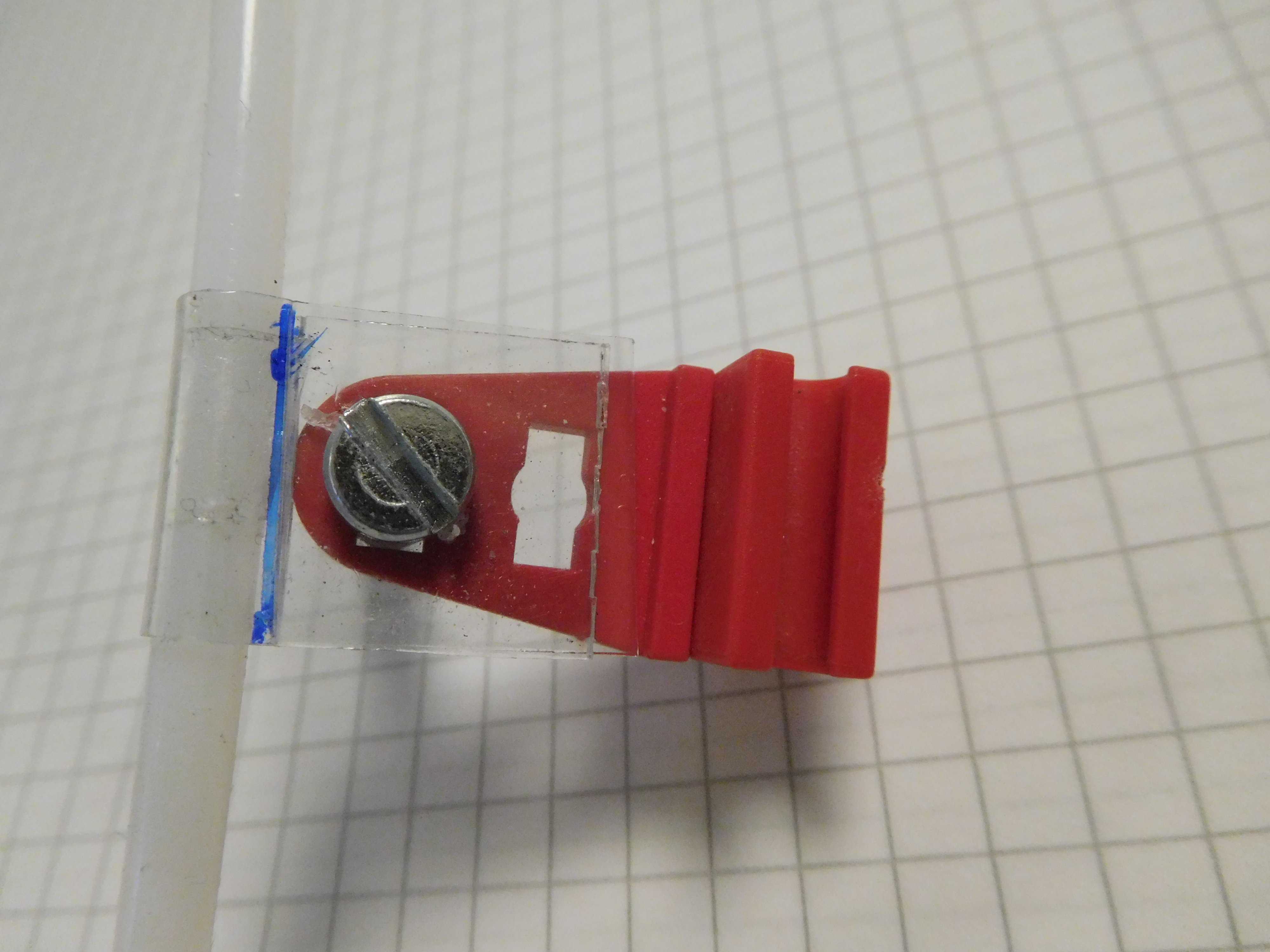 Als Schienen verwende ich 4mm-Teflonschlauch, die mit selbstgedruckten Halterungen fixiert werden: Das Vehikel in der Bahn: hat folgende Mekrmale: