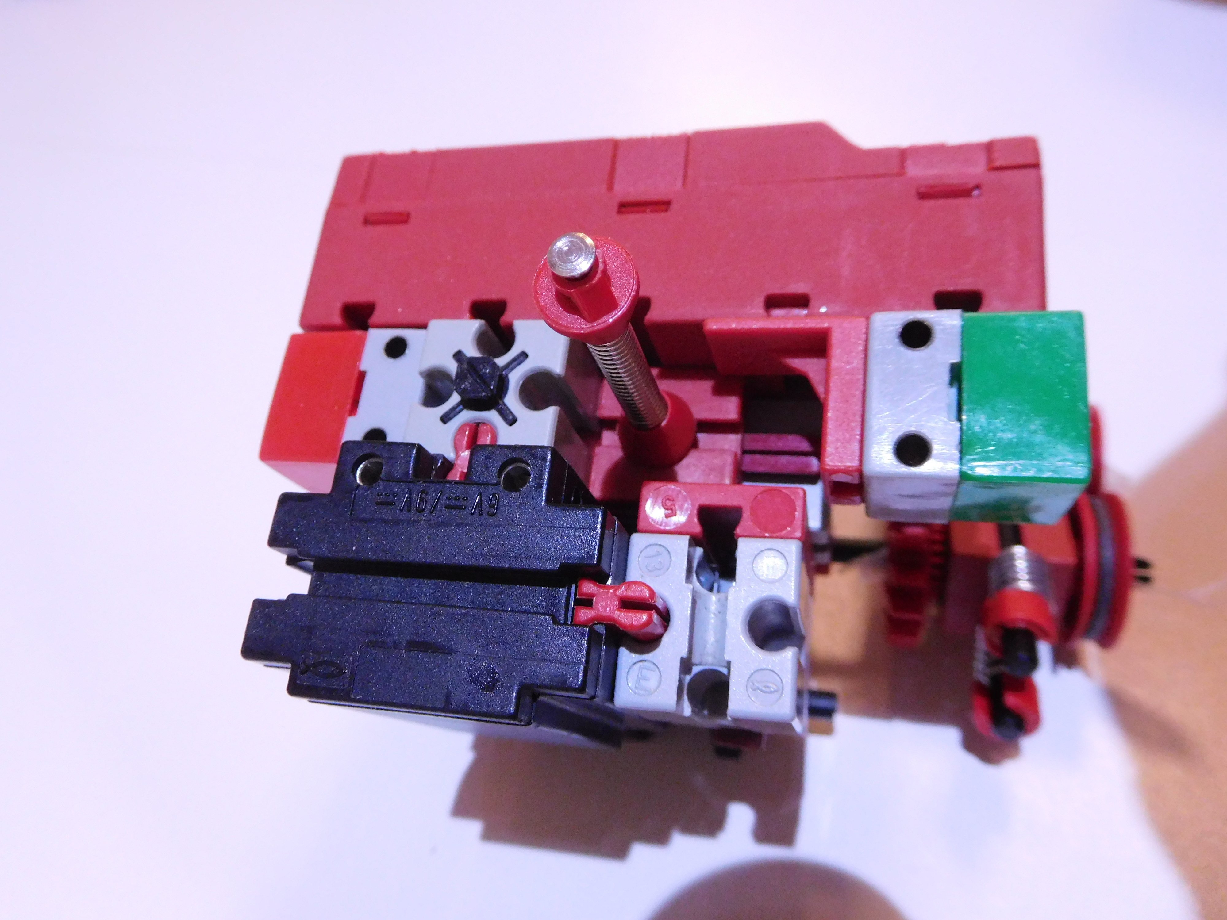 Die Rundschiene (hier 4mm Teflonschlauch) wird zwischen Nutrollen eingeklemmt, die sich über Zahnräder gegeneinander drehen. Die Antriebsräder und die Zahnräder sind mit Plastikstreifen auf die Achsen geklemmt. Die Klemmung der Rundschiene zwischen den Nutrollen erfolgt mit Gummiringen, die um die roten Lochsteine gezogen sind. Eine Rastachse musste ich stutzen