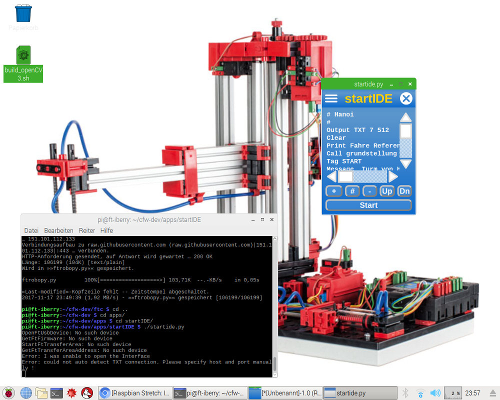 also, ich lasse den App-Code in der Entwicklungsumgebung laufen und nicht auf dem TXT. DAS ist rationell. Und weil die cfw nun mal Linux-basiert ist, ist es auch recht einfach, die benötigten Komponenten zur App-Entwicklung (v.a. Python3, PyQt4, opencv3, TouchUI, TouchAuxiliary, ftrobopy, libroboint, ggf. auch noch anderer Kleinkram) auf einem Linux-System zu installieren. Für den Raspberry wird das durch das oben verlinkte Script automatisiert.