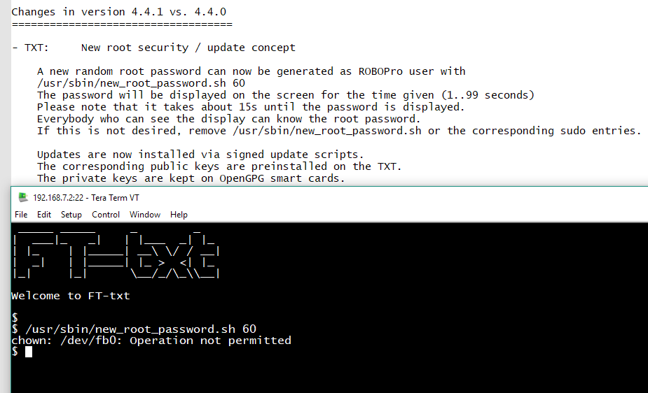 Da steht nirgendwo was von "gesamtes Linux-System aktualisiert". Das ist sportlich, wenn der TXT im IoT-Setup nun tatsächlich offiziell permanent per WLAN im Internet erreichbar sein soll. Da hat fischertechnik beschlossen, dass sie dem seit vier Jahren ohne Bug-Fixes laufenden System auch diesmal keine Sicherheits-Updates verpassen wollen? Kann ich ja kaum glauben ...