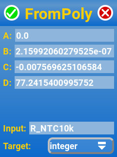 Mit den im obigen Beispiel dargestellten Koeffizienten kann z.B. der Widerstandswert eines NTC10k direkt in eine Temperatur umgerechnet werden. Dazu wurden (ich gebe es zu, per Excel) die Koeffizienten einer quadratischen Ausgleichskurve ermittelt.