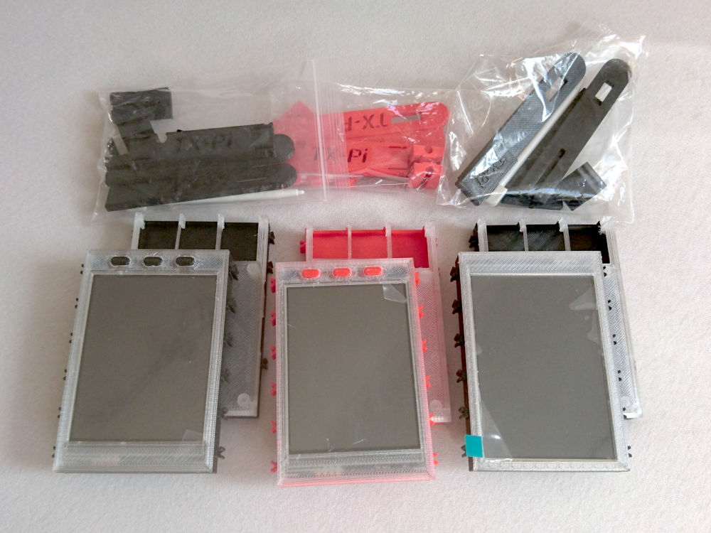 Alle Bausätze bestehend aus vier Gehäuseteilen incl. Schrauben, 3-teiligem Aufsteller, zwei Verbindungsclips, Display und Touch-Stift.